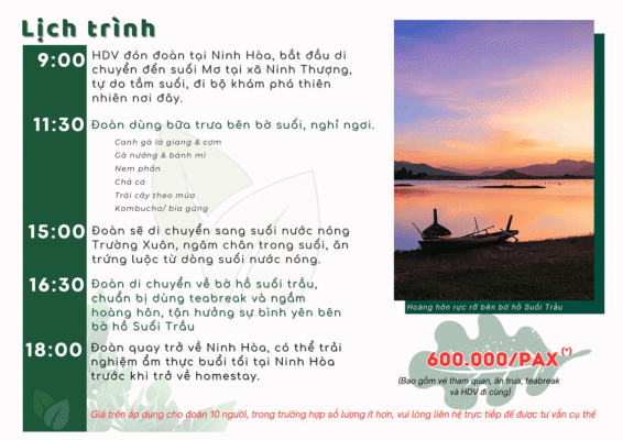 Sau đó chúng ta sẽ dừng chân bên bờ hồ Suối Trầu, dùng teabreak và thả hồn theo những tia nắng rực rỡ cuối ngày. Kết thúc một ngày trọn vẹn